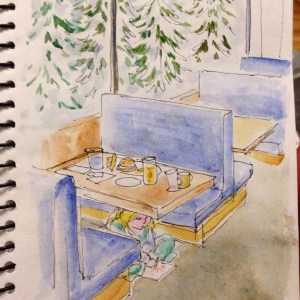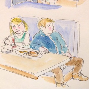 I have always tried to keep a diary when on my travels, as I find it very hard to recall the day to day happenings. In my last Sketchaday series I wrote a post nearly every day, but this time I seem to have less opportunity – I am doing a lot more hibernating in the evening, and two active grandchildren keep me busy for at least part of the daytime. So I am practising the art of visual recall. Instead of sketching on the spot, I try to remember as much as I can about the scene in front of me and then draw it afterwards.