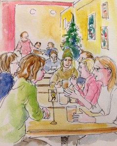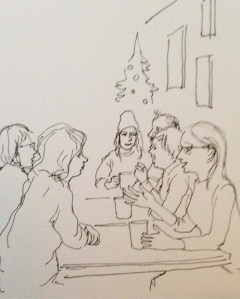 These two sketches at the Conversation Café are before and after I checked the photo I got most of the people more or less right. but I’d drawn the pictures on the right in portrait format, when they were actually landscape!