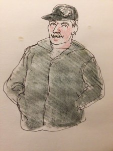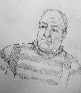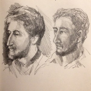 I also enjoy trying to remember individual characters. The fellow on the left was sitting next to me in the Modern, absorbed in ‘the Life and Times of Voltaire’. I couldn’t photograph him without appearing rude, so I had no way of checking my accuracy. But the fellow on the right was quite a long way away from me at the ski lodge, so I sneaked a photo of him. The second pencil sketch was the one I did from memory, before I checked the photo. The first pencil sketch was drawn afterwards, directly from the photo. I had greatly underestimated the distinctive character of his nose in my first sketch – and I hadn’t added his beard until I checked the photo!